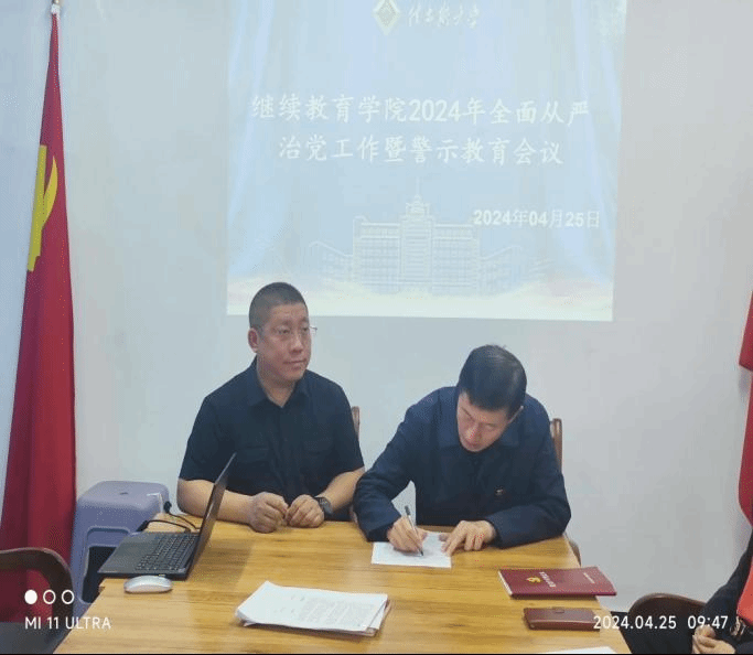 会上,李忠端首先向与会人员传达了二十届中央纪委三次全会、省第十三纪律检查委员会第三次全会和全省教育系统全面从严治党暨巡视整改工作推进会议精神。学院党总支副书记赵智勇宣读了大学下发的违纪违法案例通报,赵智勇强调,全体党员要深刻剖析党员领导干部违纪违法的主客观因素,吸取案件教训,深刻反思,防微杜渐,确保我院政治清明,无违纪违法现象?;嵋榛谷难傲舜笱Ъ臀榧?、党委常委、监察专员庞淑红同志在2024年佳木斯大学全面从严治党暨警示教育会议上的讲话。李忠端最后指出学院全体党员要认真贯彻落实上级会议部署,在工作中要严守底线,不碰红线,一体推进“三不”机制,增强两个“永远在路上”的历史使命感和政治责任感,班子成员以上率下、科级干部以身作则,努力营造风清气正的政治生态。随后李忠端与赵智勇、马超等处、科级干部签署了2024年继续教育学院全面从严治党岗位责任书和2024年继续教育学院全面从严治党中层党员干部廉政承诺书。